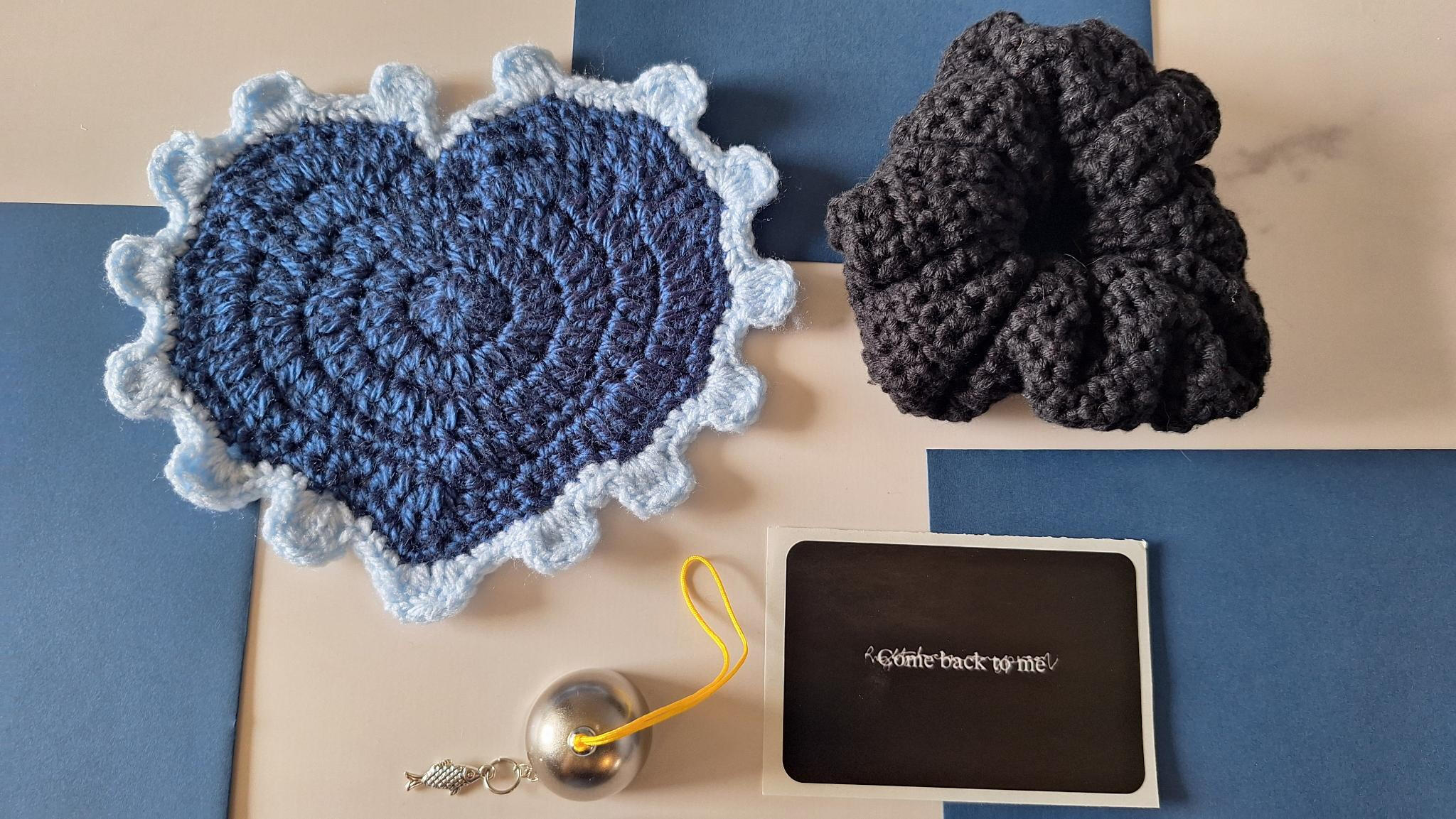 Dive into elegance with our golden fish keychain, dark blue heart coaster, sleek black crocheted scrunchie, and a "Come Back to Me" sticker. Perfect for those who love a touch of sophistication!💜 Berry Purple Set:
