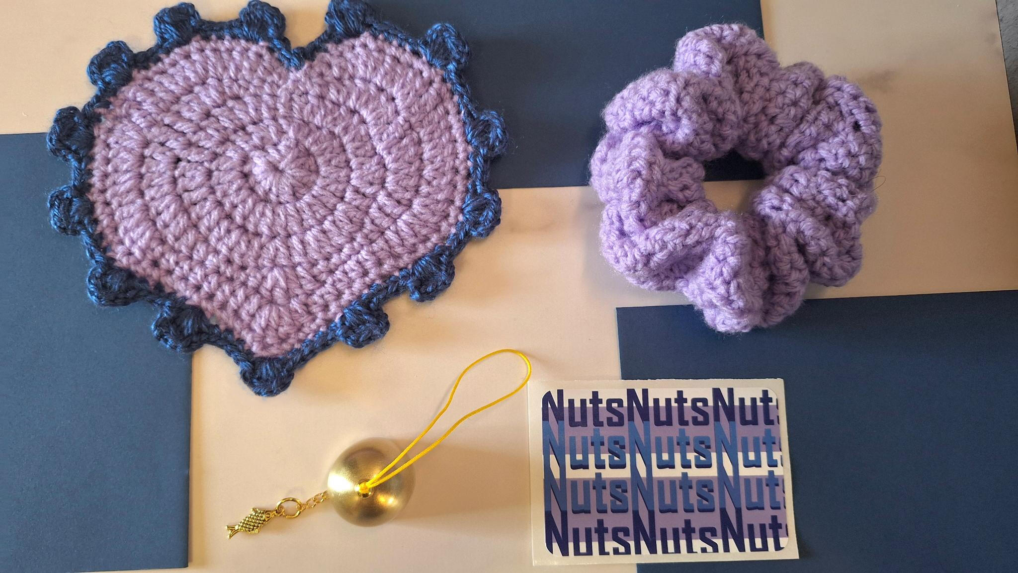 Add a pop of color to your collection with this vibrant set! Featuring a silver fish keychain, a cheerful purple heart coaster, a matching purple scrunchie, and a Nuts sticker. Ideal for those who enjoy playful and bright designs!Whether you're treating yourself or looking for the ideal gift, these sets are perfect for everyone. Don't miss out on this delightful combination of fashion and fun! Grab yours today before they swim away! 🐟✨